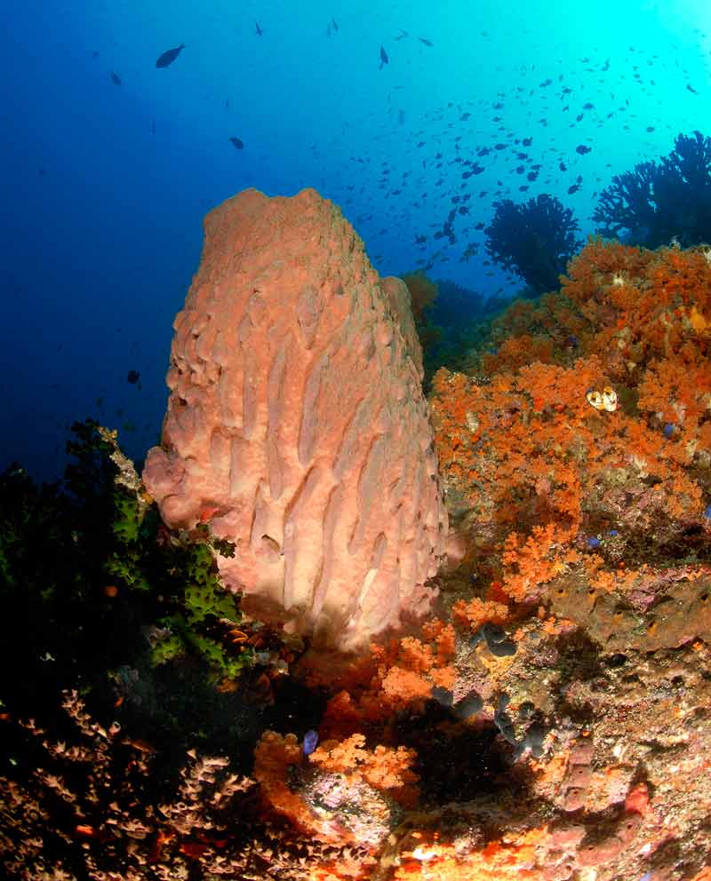 Флора и фауна: золотые и фиолетовые anthias, chromis и рыбы-ласточки, кальмары, каракатицы, мурены, eagle скаты и рифовые акулы.